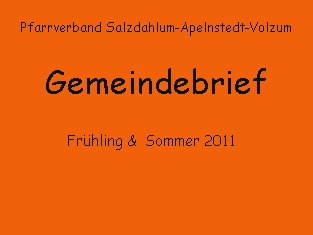 Der Redaktionsschluss für den Gemeindebrief Frühling/Sommer 2011 ist Freitag, 20. Mai 2011.Bitte die Berichte, Fotos und Anzeigen per Mail an das Pfarramt oder per Mail an Marion Köchy.